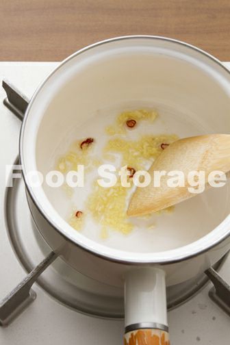 鍋にサラダ油を熱し、にんにく、しょうが、乾燥唐辛子を入れて弱火で香りが立つまで炒める。