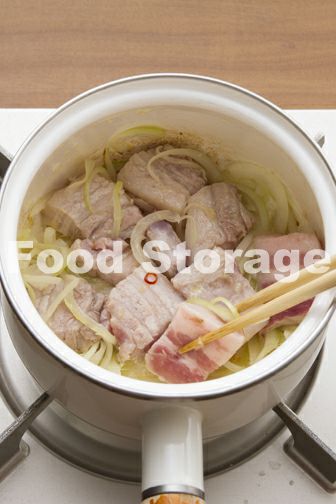 豚肉は3cm幅に切り、塩、こしょうをふる。玉ねぎは薄切りにし、トマトはヘタを取らずにフォークで刺して熱湯に入れ、すぐに冷水にとって湯むきし、ざく切りにする。