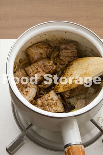 3に玉ねぎを入れて中火でしんなりするまで炒め、2の豚肉を加えてさらに炒める。Aを加え、全体になじむように混ぜる。 |