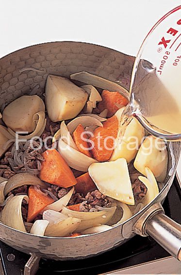 鍋にサラダ油を熱し、玉ねぎを炒める。透き通ってきたら牛肉、じゃがいも、にんじんを加えて炒め、油が回ったら糸こんにゃくとAを加えて煮る。 |