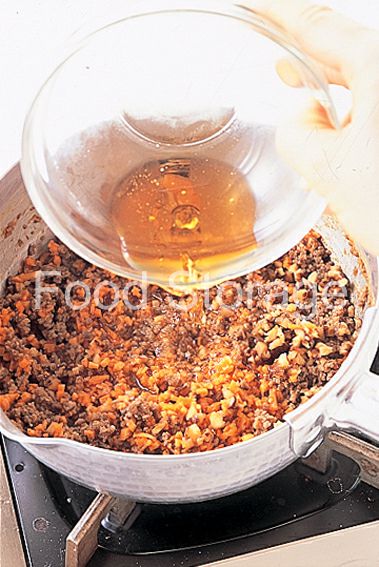 鍋にひき肉、Aを入れてよく混ぜてから火にかける。菜箸を数本持ってほぐすように混ぜながら火を通す。 |