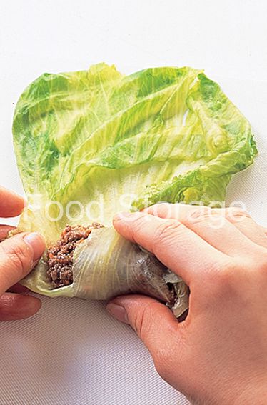 レタスはさっとゆで、水気をよくふき取る。レタス1枚に4等分にした3をのせて包み、ゆでた三つ葉で結び、器に盛る。同様に残り3個も作る。 |