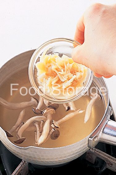 鍋にだし汁としめじ、ほたて缶を汁ごとほぐして入れ、火にかける。沸騰したられんこん、赤ピーマンを加えて煮る。 |
