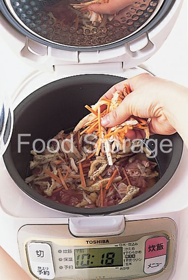 米とだし汁の入った炊飯器にBを加えてよく混ぜ、2、油揚げ、にんじん、しいたけ、水けをきったごぼうをのせて普通に炊く。 |