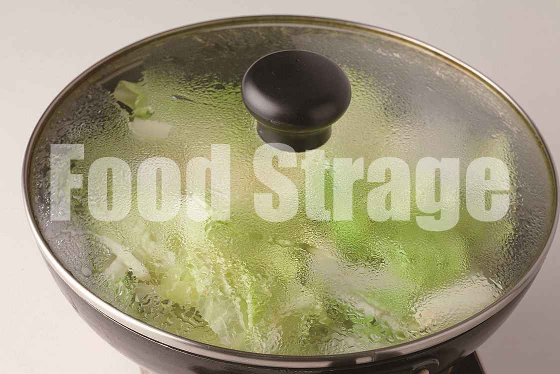 白菜のかたい芯の部分はすぐには火が通りません。ふたをして少々蒸し焼きにすれば、全体にほどよく火が通ります。 |