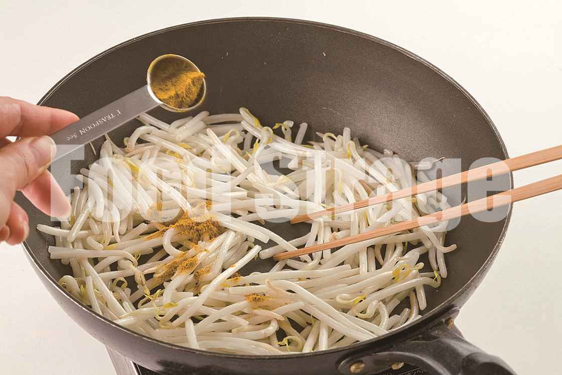 3.【ポイント】もやしがしんなりしたらカレー粉の入れどき
