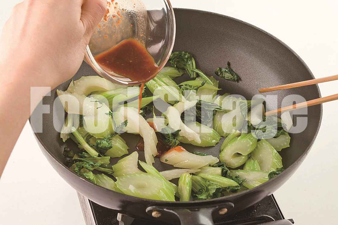 茎と葉では火の通りに差があるので、必ず茎のほうがしんなりしてから調味料を加える。先に茎から炒めるのも忘れずに。 |