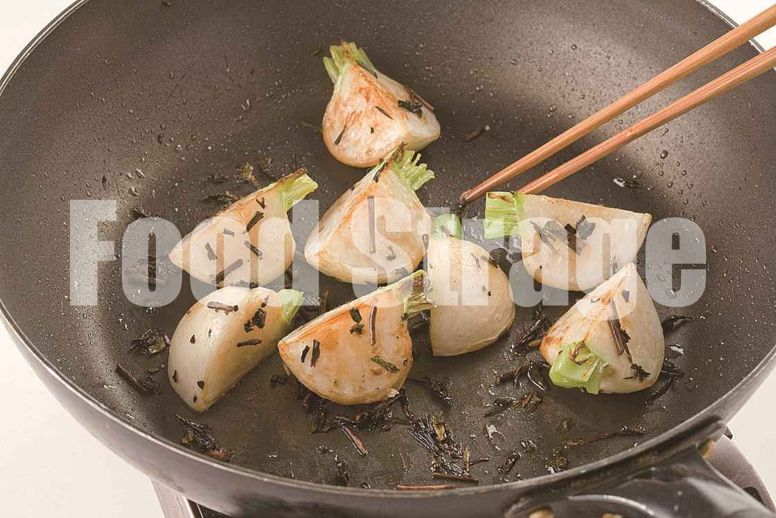 フライパンにサラダ油を熱してかぶを炒め、焦げ目がついたら茶葉と酒を加えて水分が飛ぶまで炒める。 |