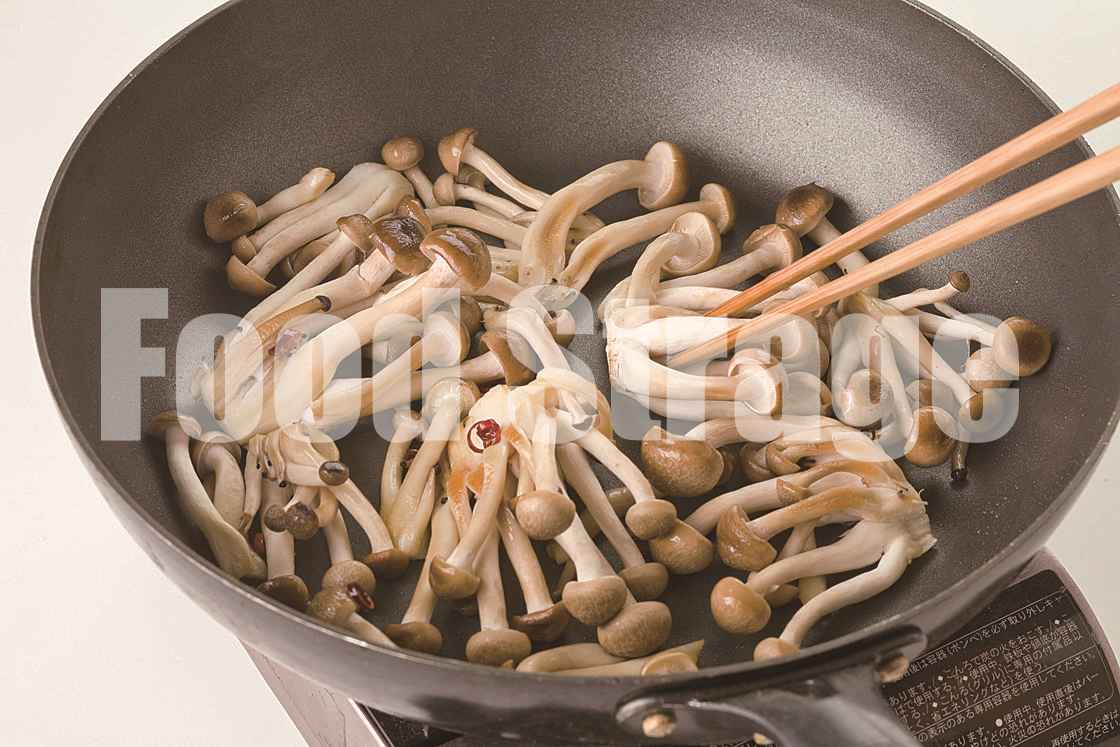 しめじを赤唐辛子といっしょにサラダ油で炒め、調味する前になじませておくと、ほどよい辛みがつきます。 |