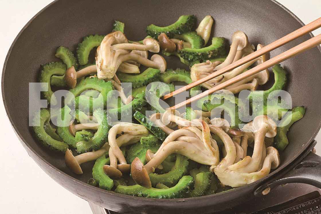 しめじは石づきを切り落とし、小房に分ける。ゴーヤーは縦半分に切って種とワタを除き、5mm厚さの半月切りにする。 |