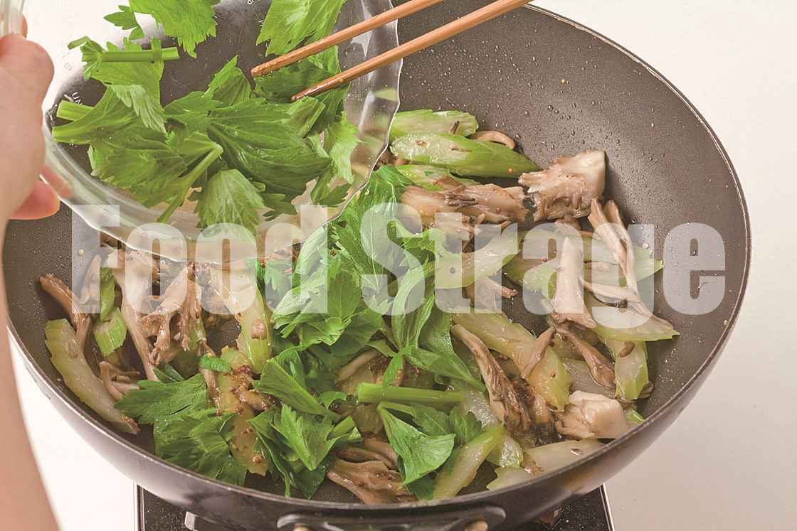 フライパンにサラダ油を熱し、セロリの茎とまいたけを入れて炒める。 |