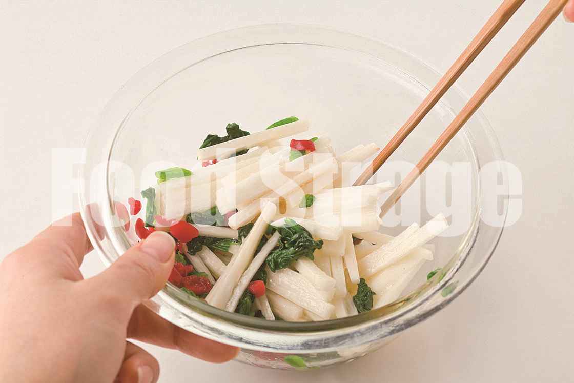 調味料と味のからみやすいほうれん草を先に混ぜ、ほうれん草入りのたれを長いもにからめるようにして混ぜます。 |