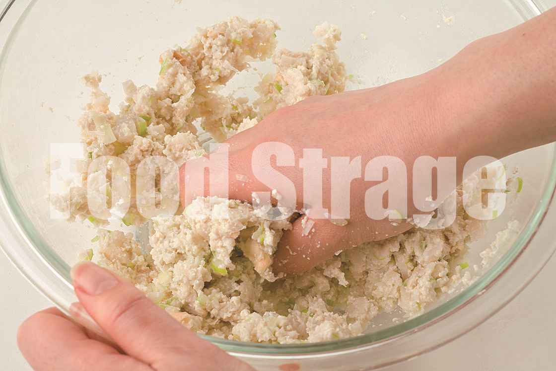 ボウルに1の豆腐、長ねぎ、れんこんのすりおろしと角切り、手で砕いた麩を入れてよく混ぜ、Aを加えてさらによく練り混ぜる。 |
