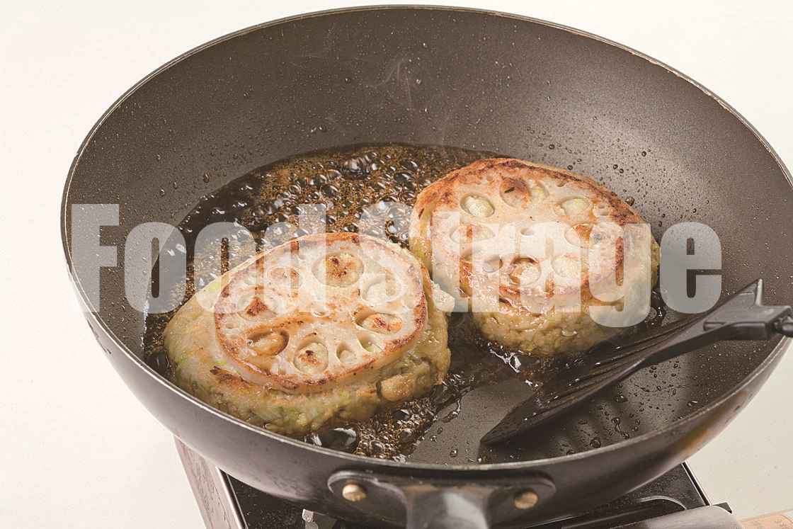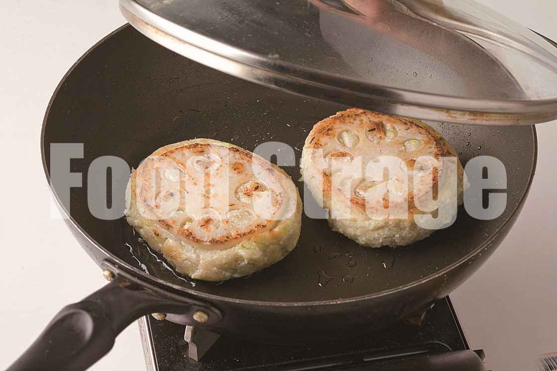 フライパンにサラダ油を熱し、3をれんこんが下になるように入れて焼き、こんがりしたら裏返し、ふたをして弱火で5分ほど蒸し焼きにする。 |