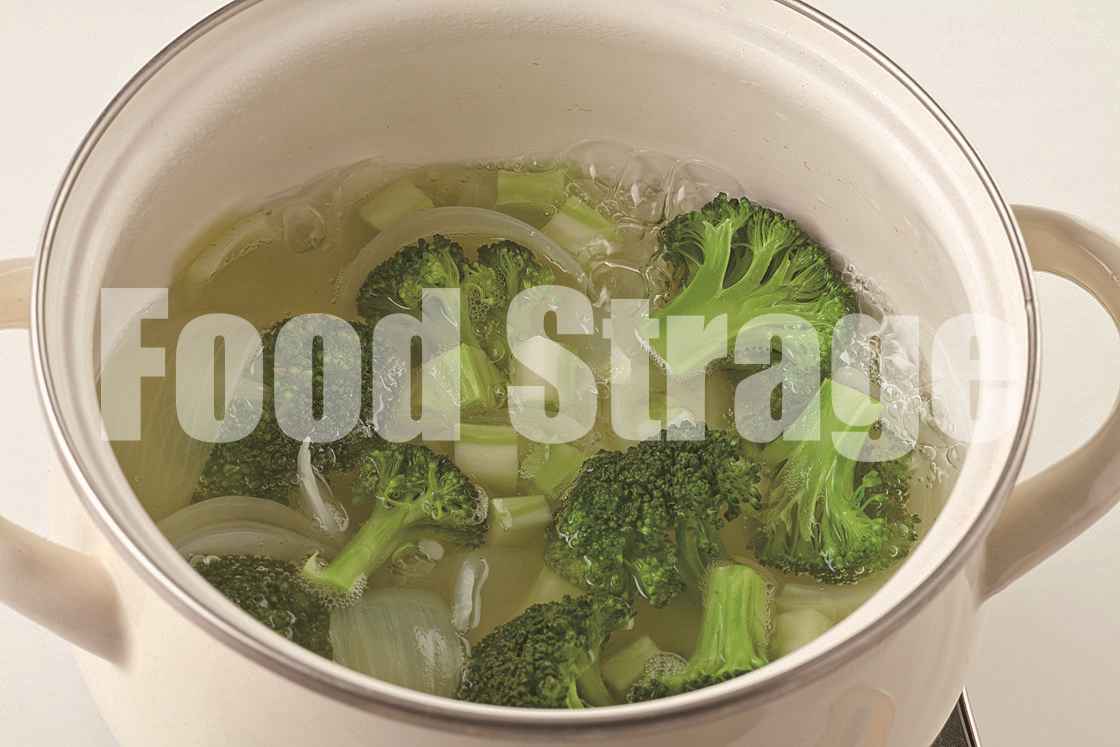 Aを鍋に入れて煮立て、玉ねぎ、にんにくを加え、玉ねぎがしんなりしたらブロッコリーを加えて3~4分煮る。 |