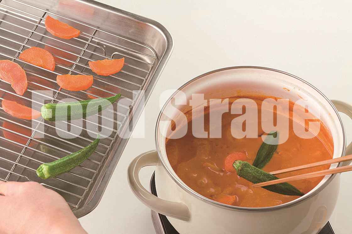 にんじんは5mm厚さの半月切りにし、オクラはガクを取って板ずりし、よく洗ってペーパータオルで水けを拭く。 |