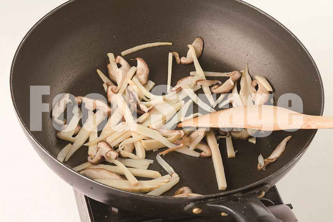 たけのこはせん切りにする。しいたけは軸を切り落とし細切りにする。 |