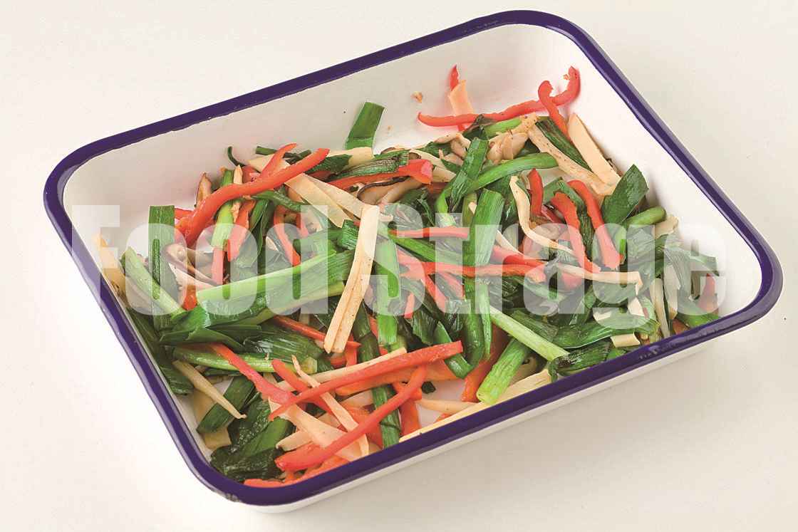 赤ピーマンはヘタと種を取り除き、千切りにする。にらは5cm長さに切る。 |