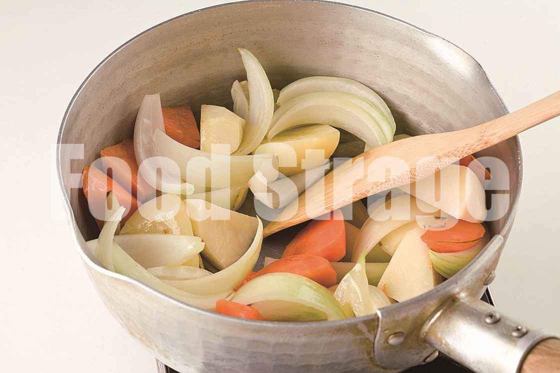 じゃがいも、にんじんは皮をむき、食べやすい大きさに乱切りにしてじゃがいもは水にさらす。玉ねぎは6等分のくし形に切る。 |