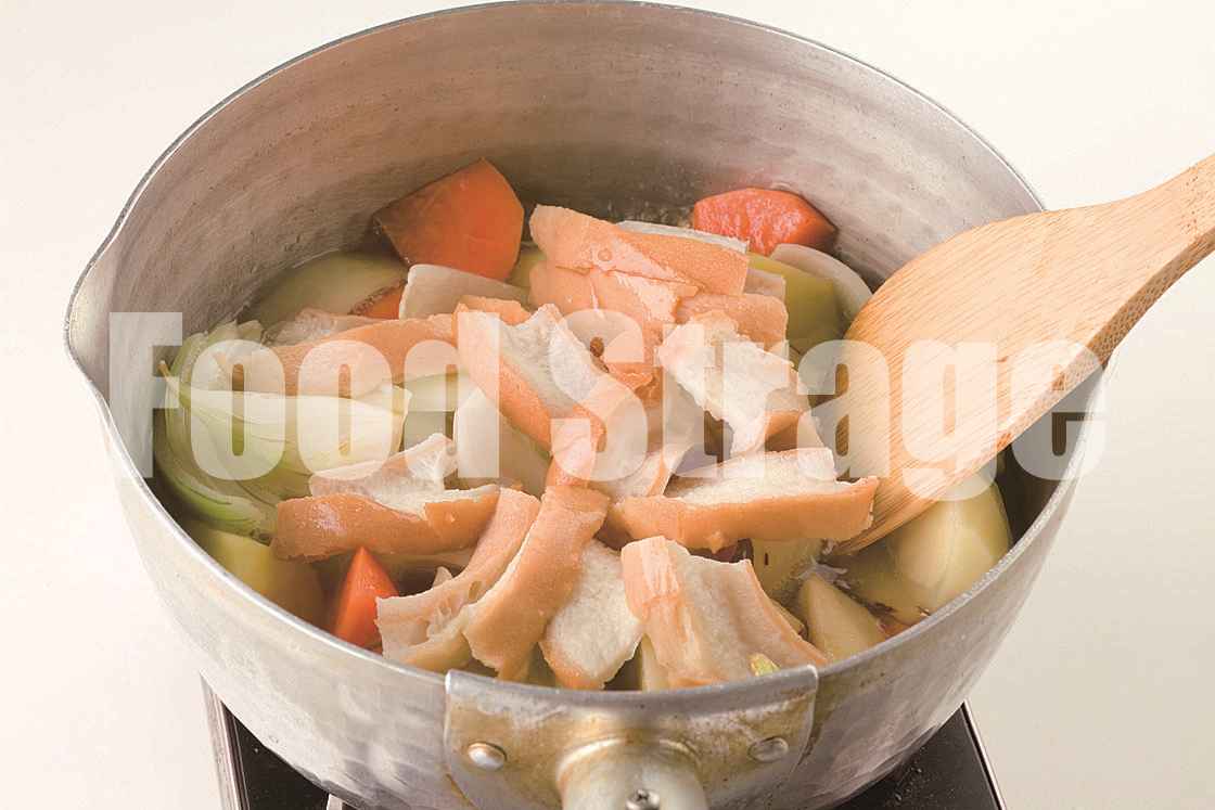 肉の代わりに加えたのは、麩の中でも大きな車麩。水でもどし、4つ割りにしたら、小さな麩をそのまま加えてるよりも、見た目、味ともに存在感をアピール。 |