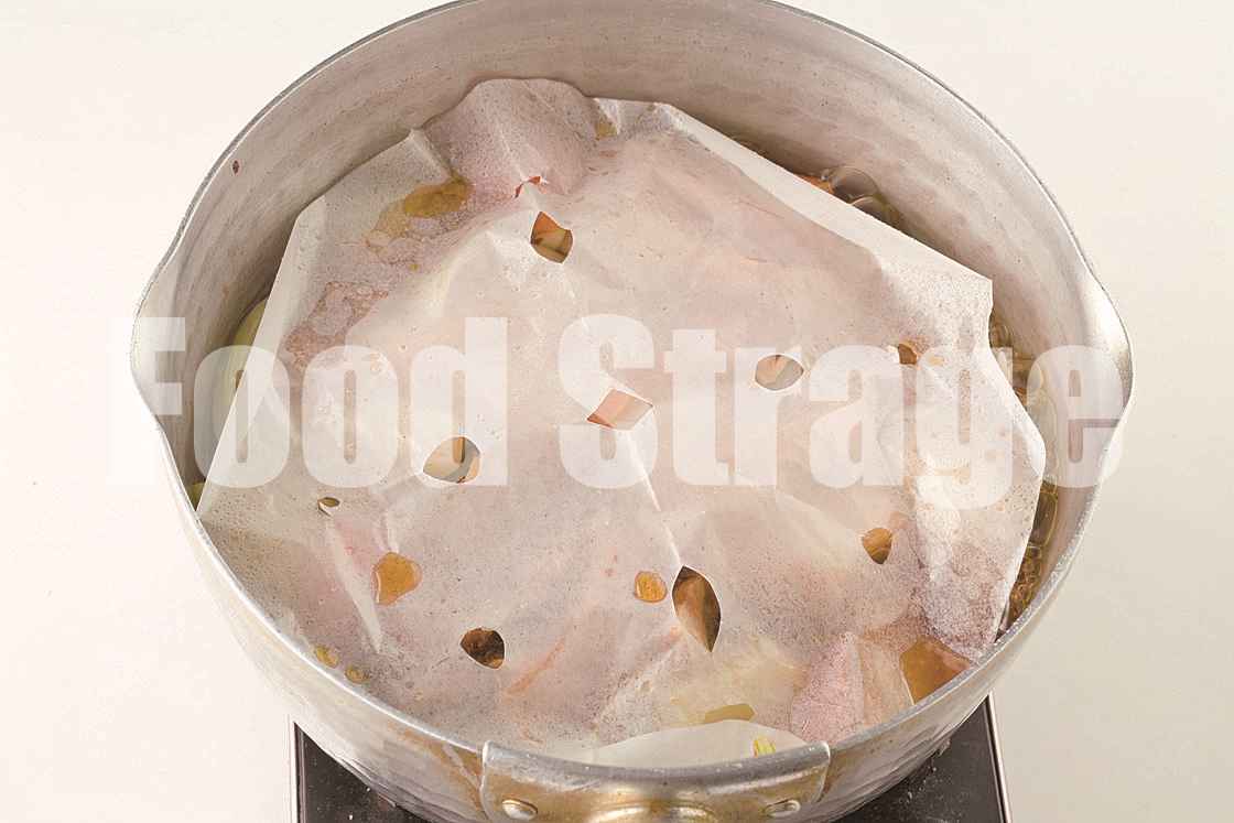しょうゆを加えて落としぶたをし、煮汁が半分くらいになるまで煮て、グリーンピースを加え、さっと火を通す。 |