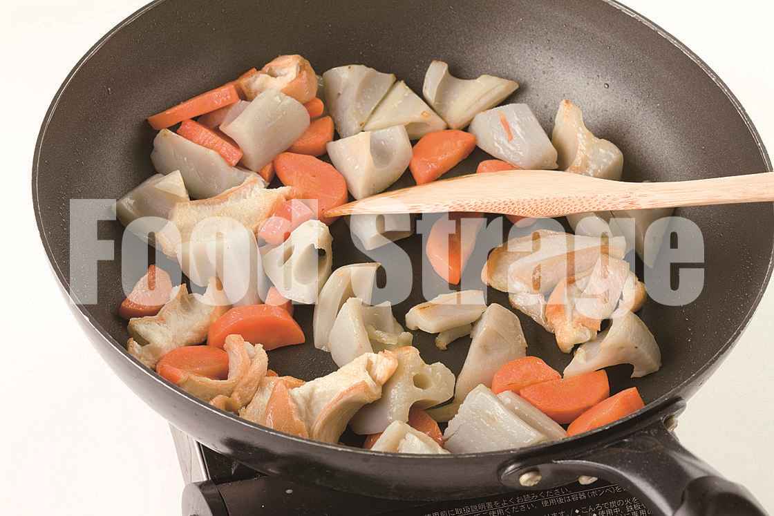 れんこんは皮をむいて乱切りにする。にんじんは皮をむき、1cm厚さの半月切りにする。 |