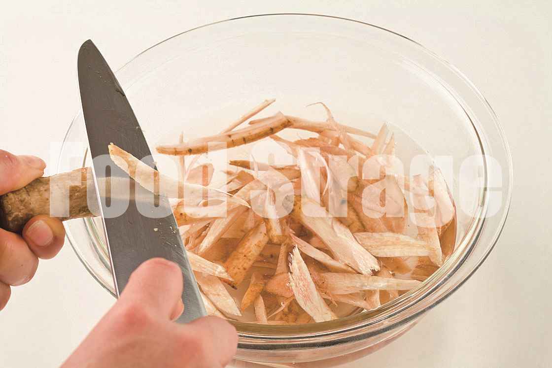 ごぼうはたわしでよく洗い、大きめのささがきにして水にさらす。にんじんは洗って同じ大きさのささがきにする。 |