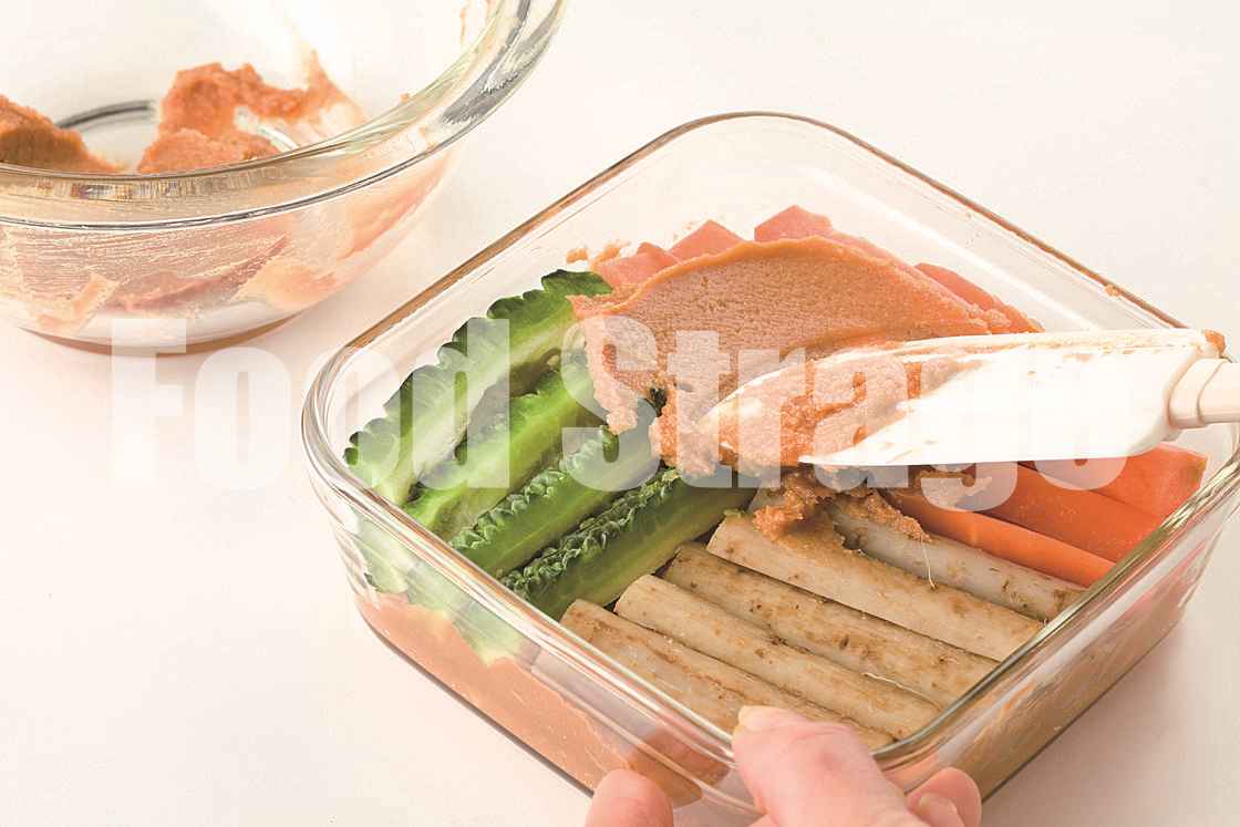 ごぼうはたわしで洗って7cm長さに切り、太い部分は半分に割り、熱湯で5分ほどゆでる。にんじんは皮をむいてごぼうと同じ長さの拍子切りにする。ゴーヤーは縦半分に切り、ワタと種を取ってにんじんと同じ大きさに切る。 |