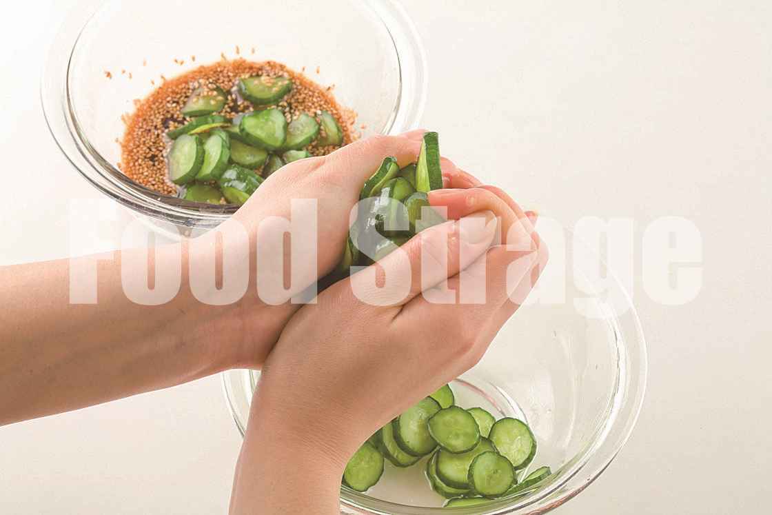 きゅうりがしんなりしたら、手で水けをしっかりと絞る。 |