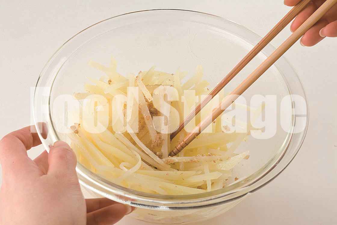 じゃがいもは5mm幅の細切りにし、塩少々(分量外)を加えた熱湯で1分ほどゆでる。 |