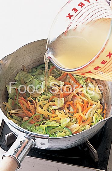 玉ねぎは薄切り、にんじん、ピーマンはせん切りにする。キャベツは芯の部分はせん切り、葉は小さめのざく切りにする。 |