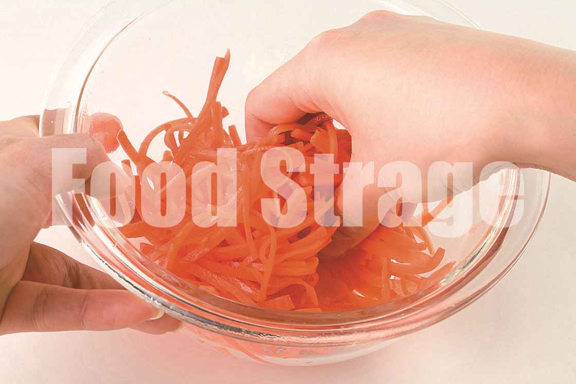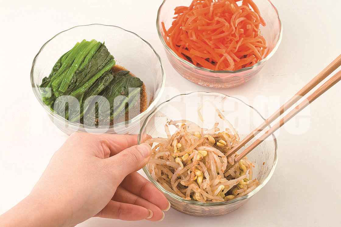 ほうれん草と豆もやしは、それぞれ熱湯でゆで、冷水にさらして水けを絞る。ほうれん草は5cm長さに切る。にんじんはせん切りにし、塩でもんでしんなりさせ、水けをよく絞る。 |