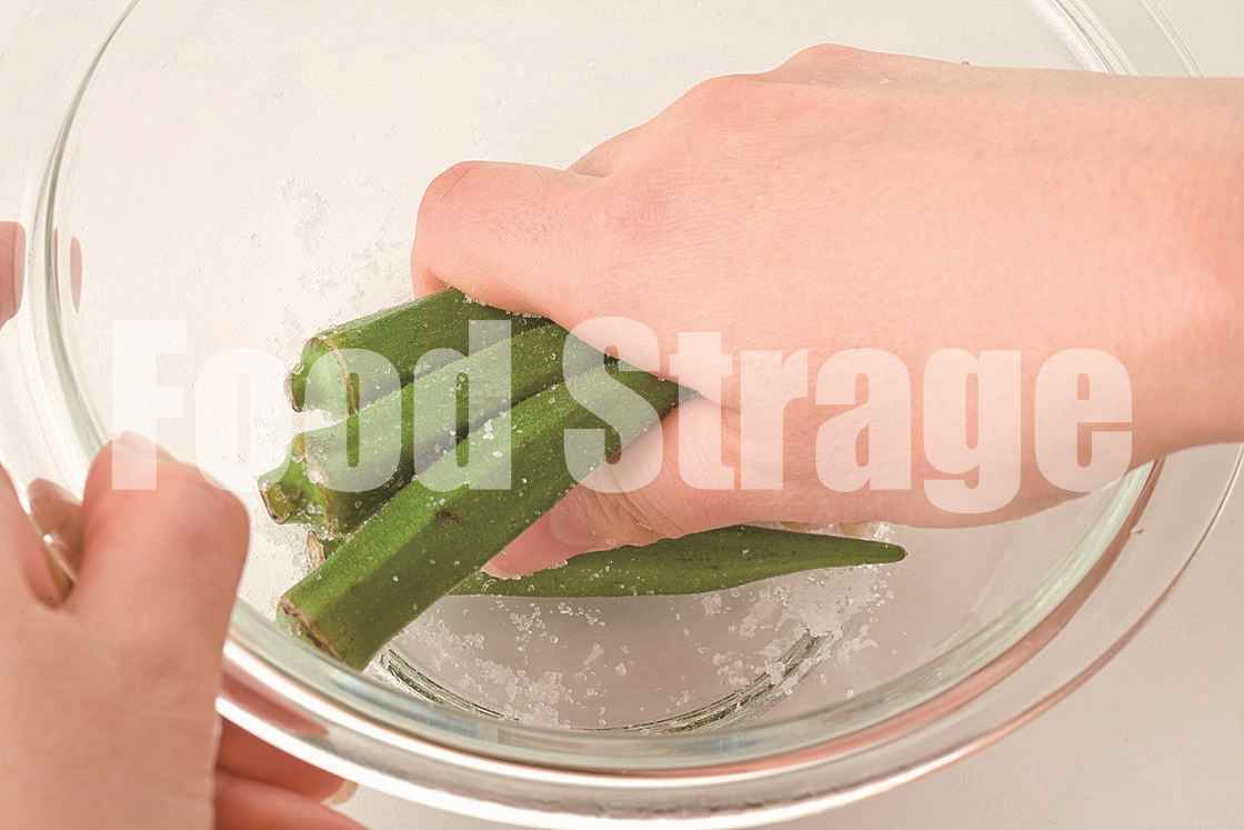 オクラの表面の毛は板ずりして取りますが、少量なら塩をつけてもむだけでok。このひと手間で舌触りが違います。 |