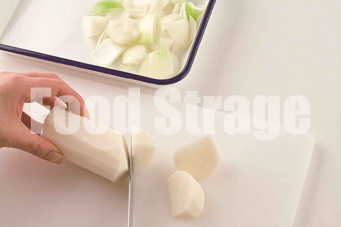 長いも、玉ねぎは皮をむき、乱切りにする。 |