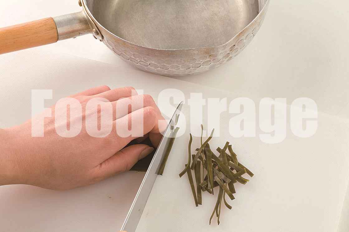 鍋に水、汚れを拭いた昆布を入れて水にかけ、沸騰直前に昆布を取り出し、汁は冷ましておく。取り出した昆布は細切りにする。 |