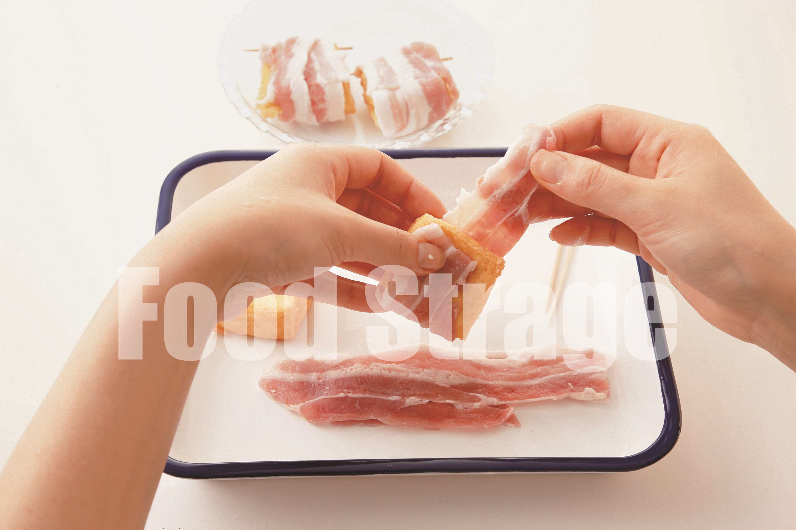 豚バラを半分に切り、1に1枚ずつ巻き付け、つまようじでとめる。 |