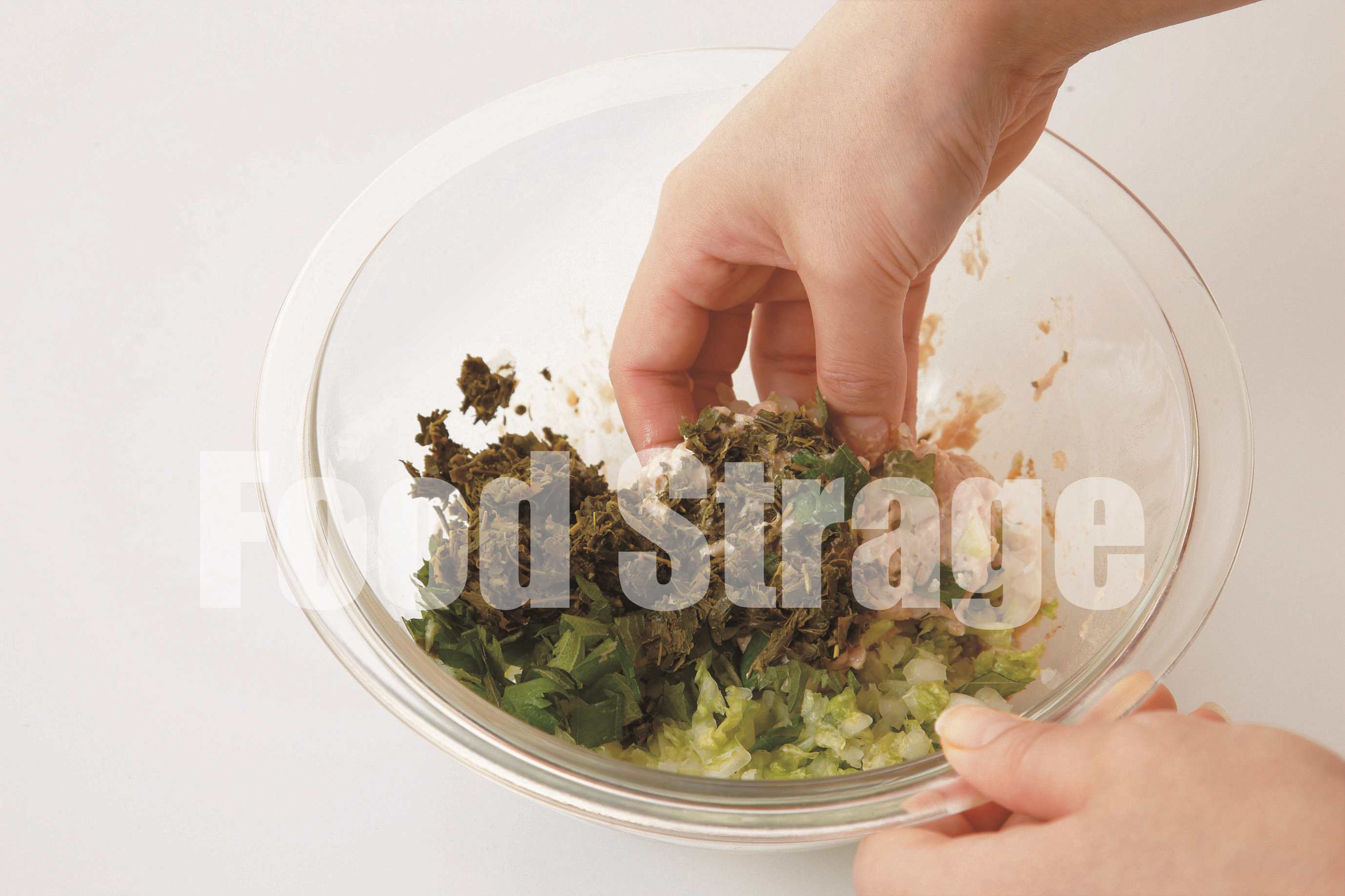 白菜は粗みじん切りにして塩少々(分量外)をまぶしておき、しんなりしたら水けを絞る。青じそは粗みじん切り、茶がらは水けを絞る。