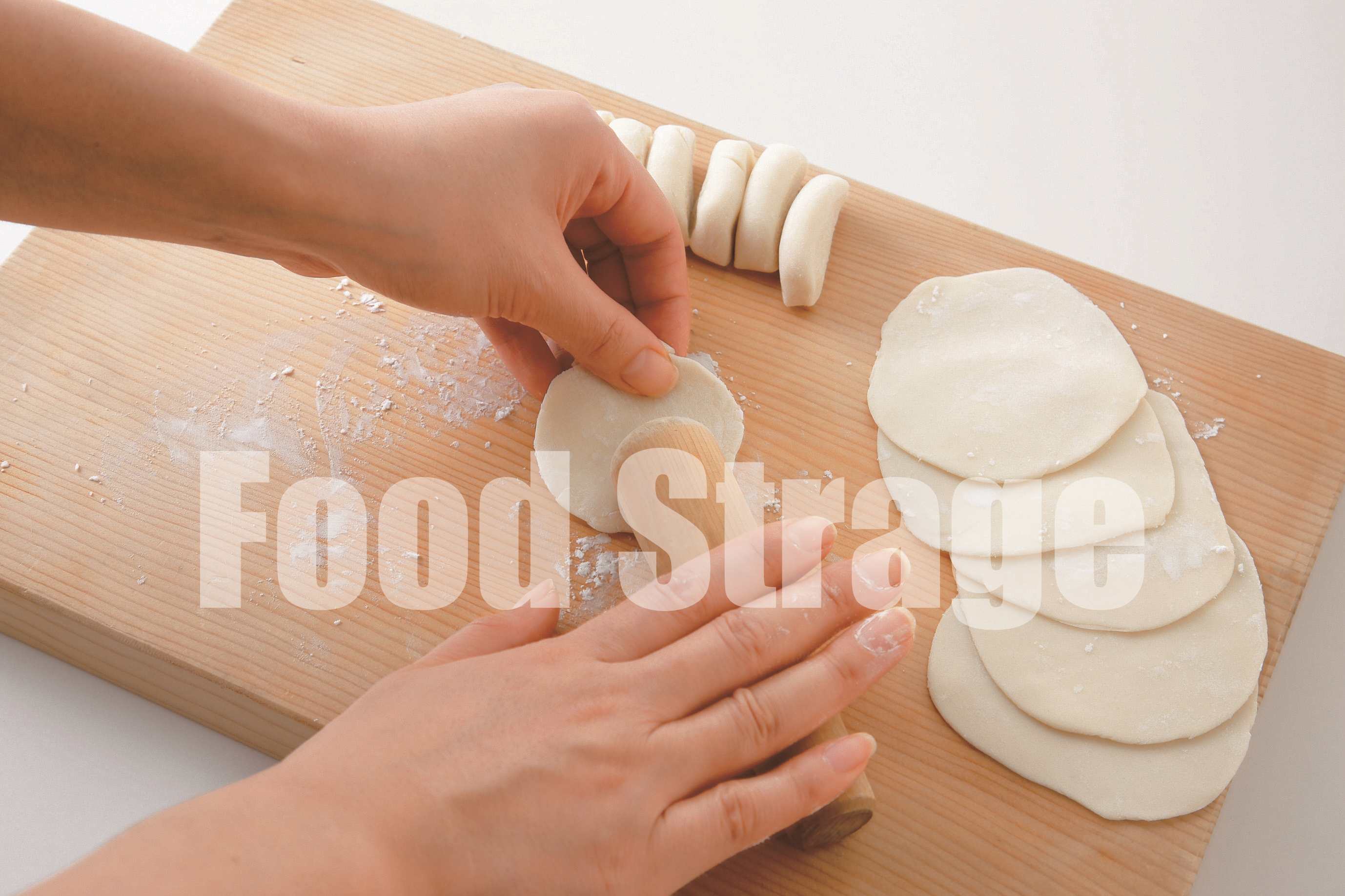 1を棒状にのばして12等分に包丁で切る。片栗粉をふったまな板でひとつずつめん棒を使って直径10cmほどの円形に薄くのばす。