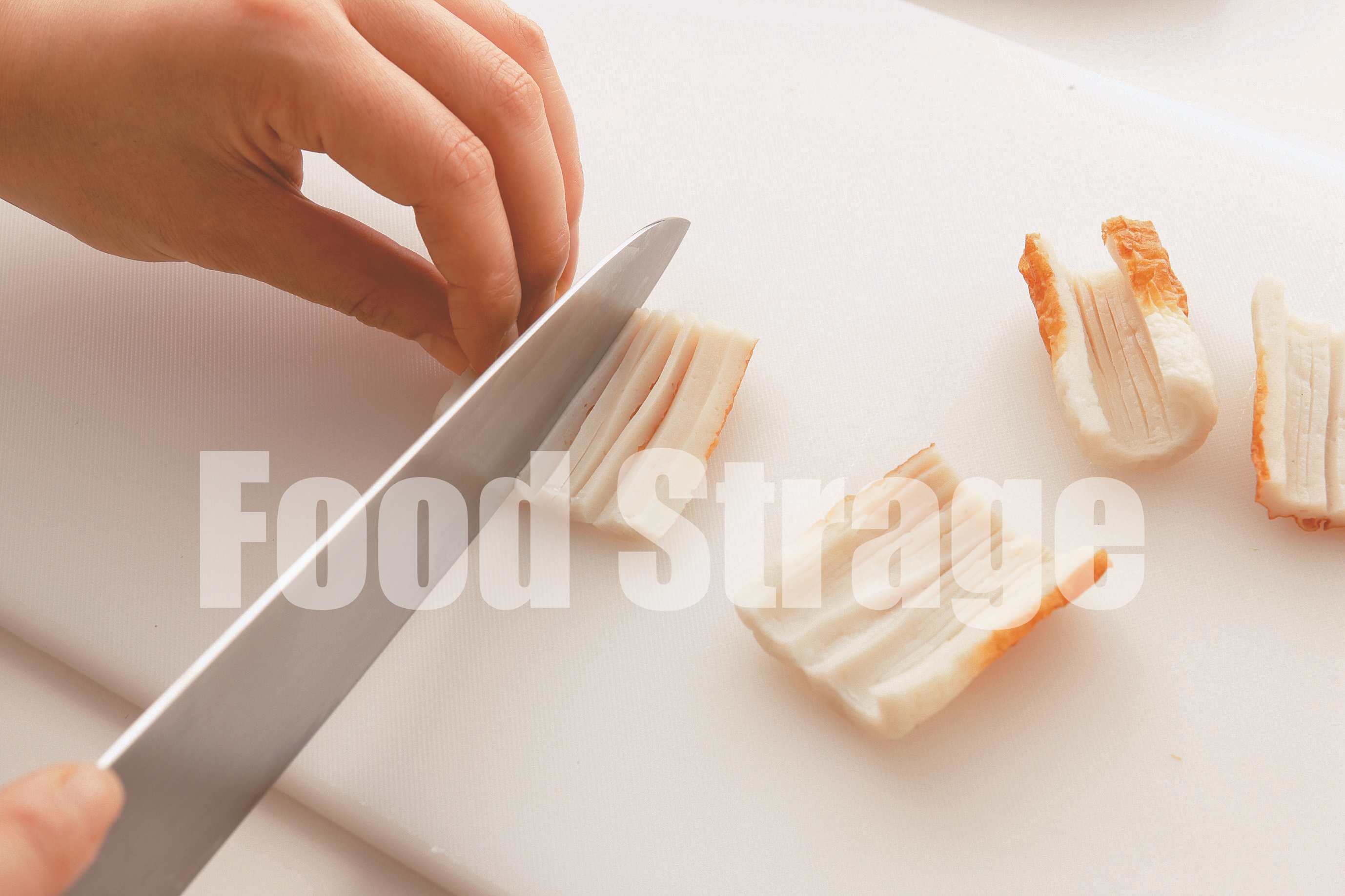 ちくわを切り開き、裏に浅く切り込みを入れると、ちくわが平らになり、見た目がうなぎに近づきます。切り込みは真ん中から外側に浅く入れるのがコツ。 |
