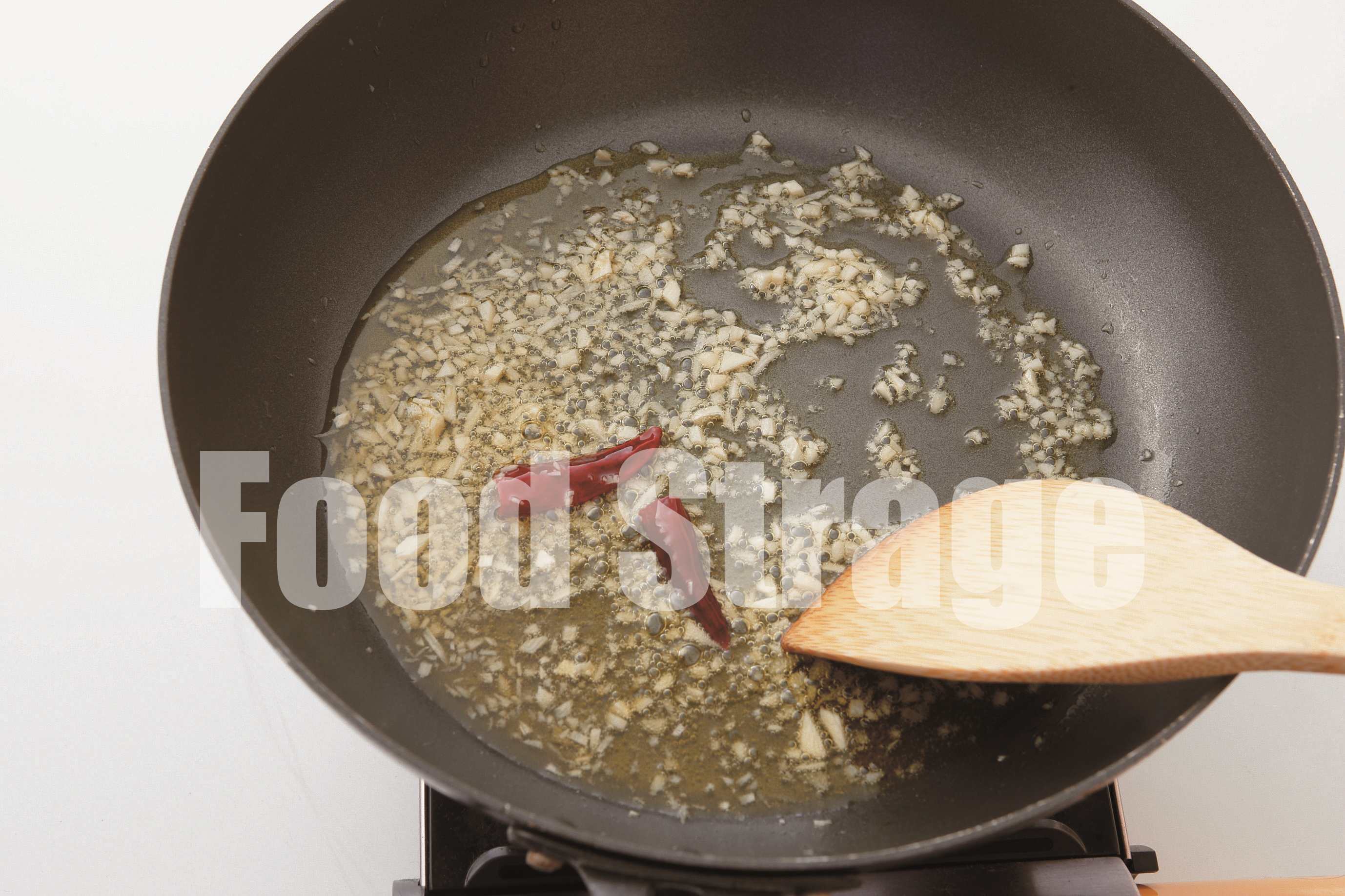 4 フライパンにオリーブ油、3を入れて弱火にかけ、香りが出たら2に加えて炒める。