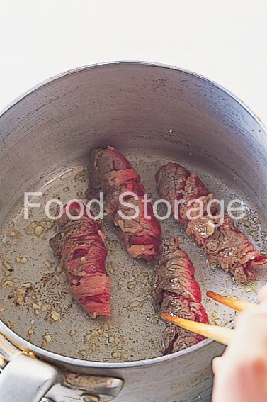 牛薄切り肉は広げて塩、こしょうをし、巻いて形を整える。 |
