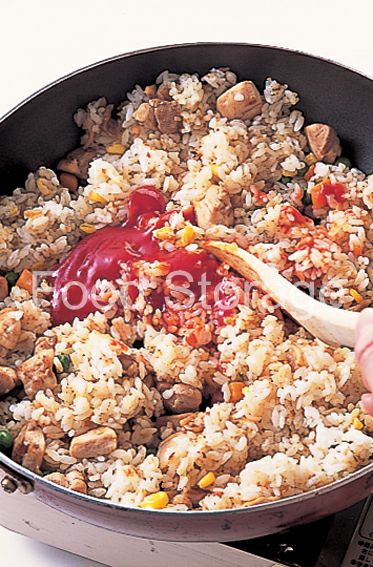 1にごはんを加えて炒め合わせ、ケチャップ、塩、こしょうで調味し、2等分にして皿に盛る。 |