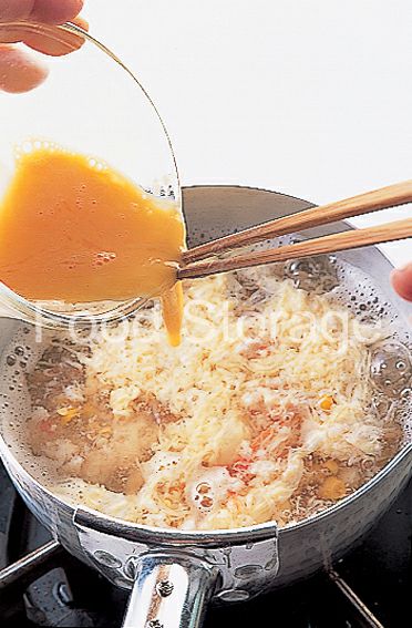 塩、こしょうで調味し、溶き卵を回し入れて卵が浮いてきたらひと混ぜして火を止める。 |