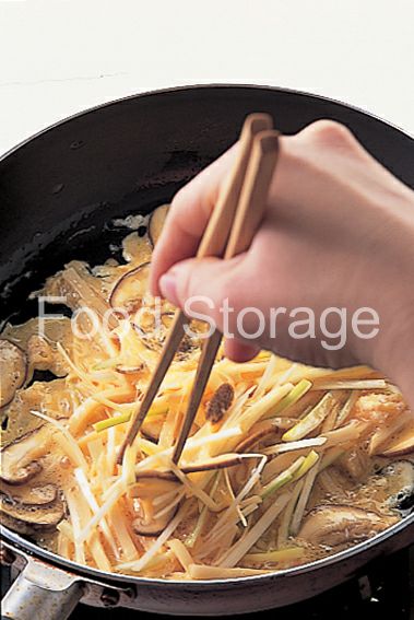ゆでたけのこは細切りにし、しいたけは薄切り、長ねぎはせん切りにし、白い部分5㎝分は白髪ねぎにする。 |
