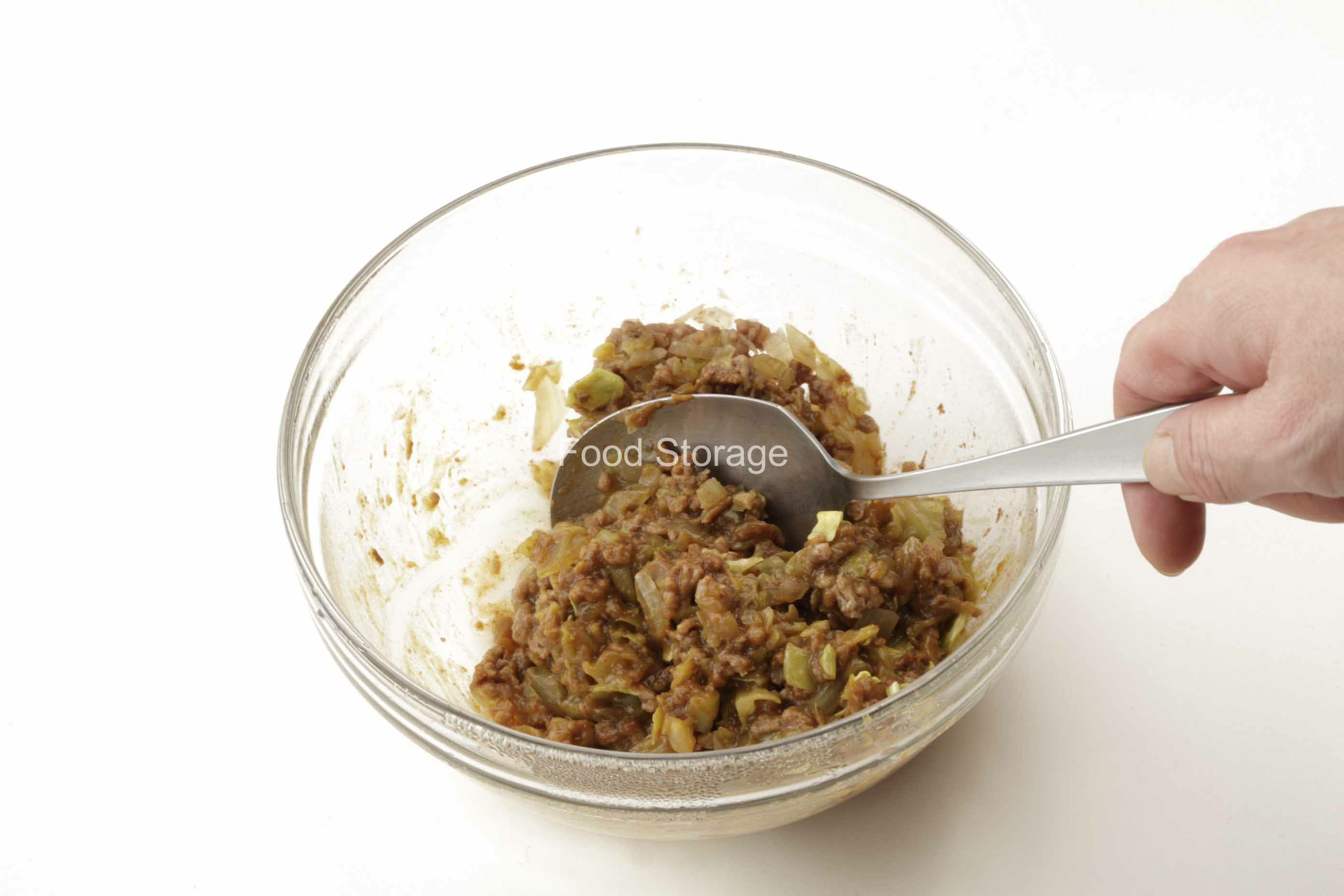 (2)耐熱容器に1、ひき肉、Aを入れてよく混ぜ合わせる。