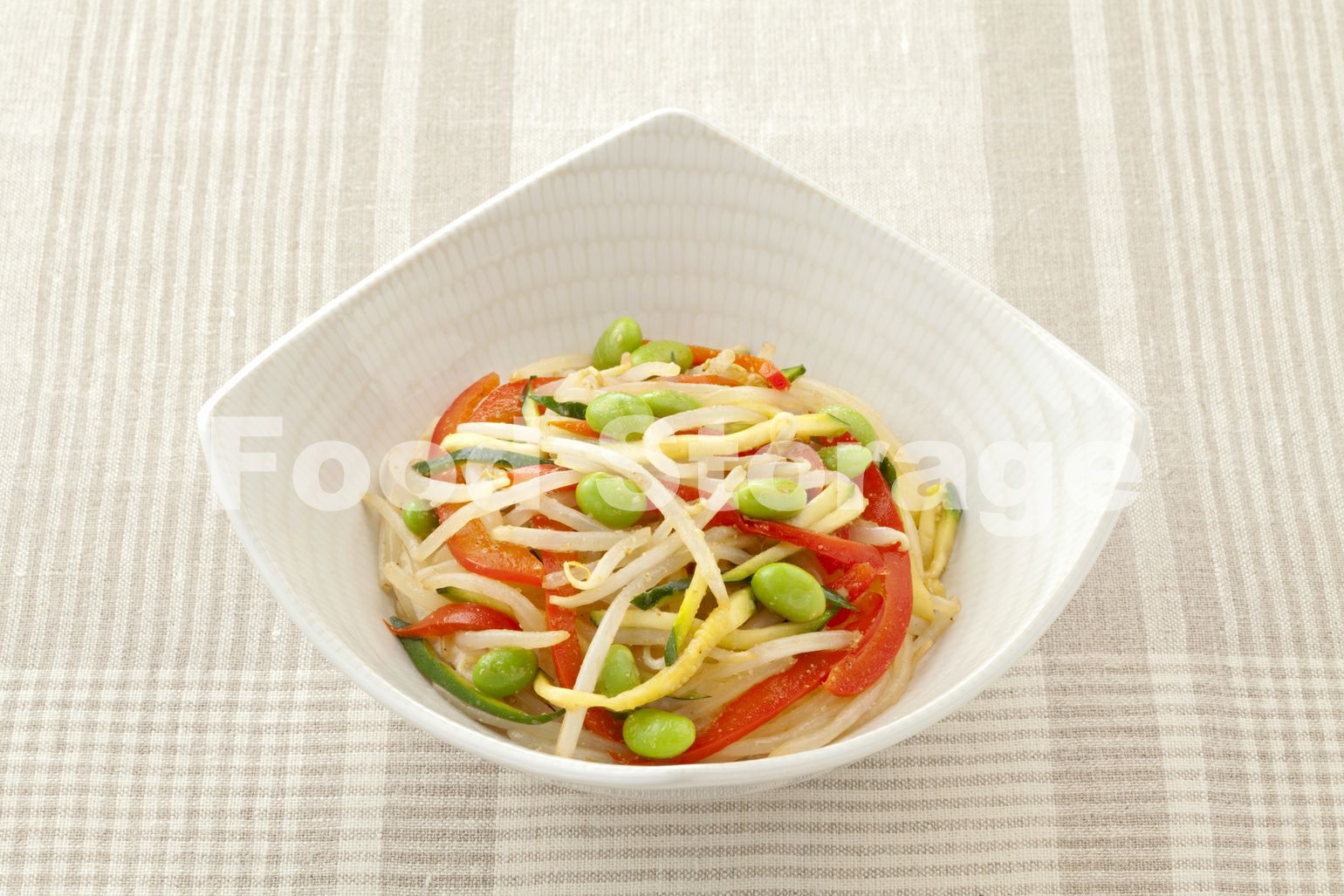 きゅうり、にんじんは細切りに、トマトは半月切りにする。サンチュ、青じそ、白髪ねぎ、2とともに器に盛る。 |