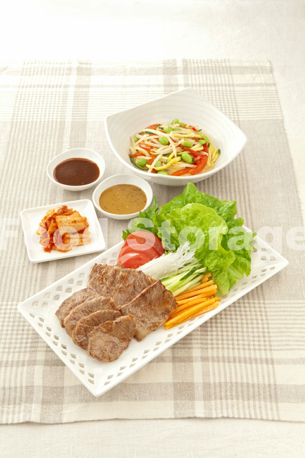サンチュ、青じそに2、残りの野菜やキムチをお好みで巻き、合わせたAまたはBにつけていただく。 |