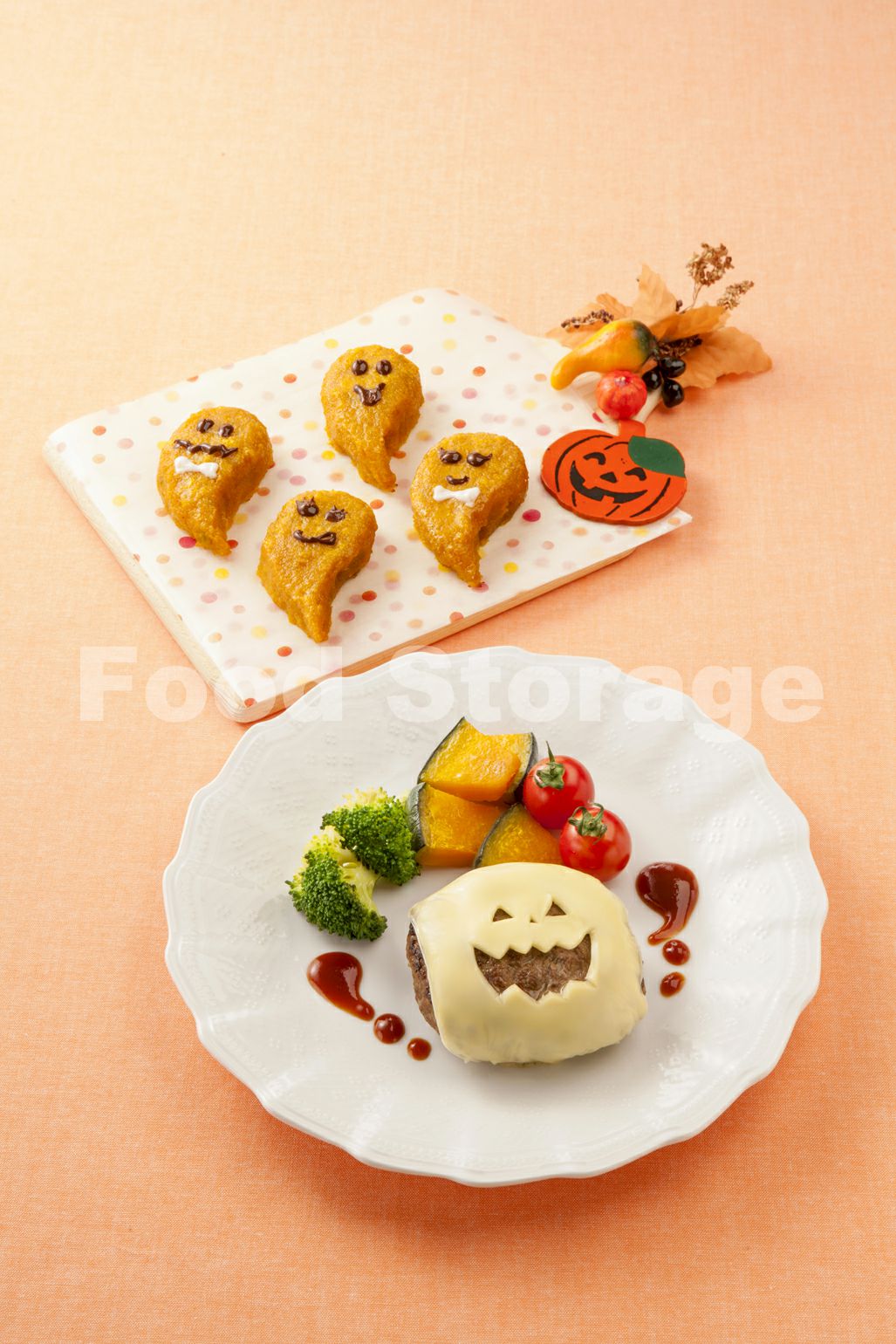 (4)3を器に盛ってハンバーグの上におばけの顔の形にくりぬいたチーズをのせ、合わせたBをかけていただく。
