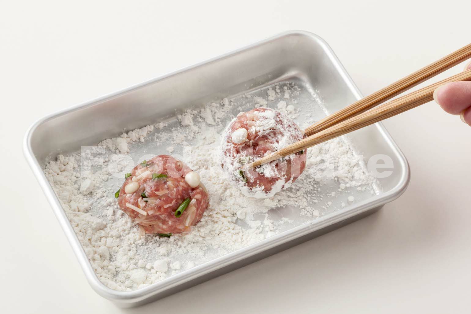 (1)えのき、小ねぎは1cm幅に切り、ひき肉、塩、片栗粉と合わせて練り混ぜる。