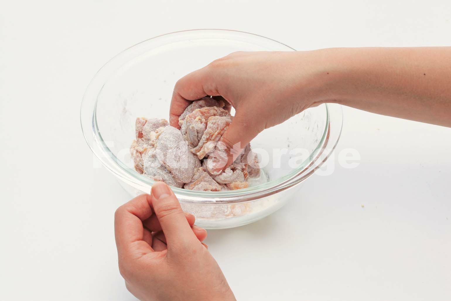 ボウルにBを入れて混ぜ、鶏肉にまんべんなくまぶし、余分な粉を軽く落とす。 |